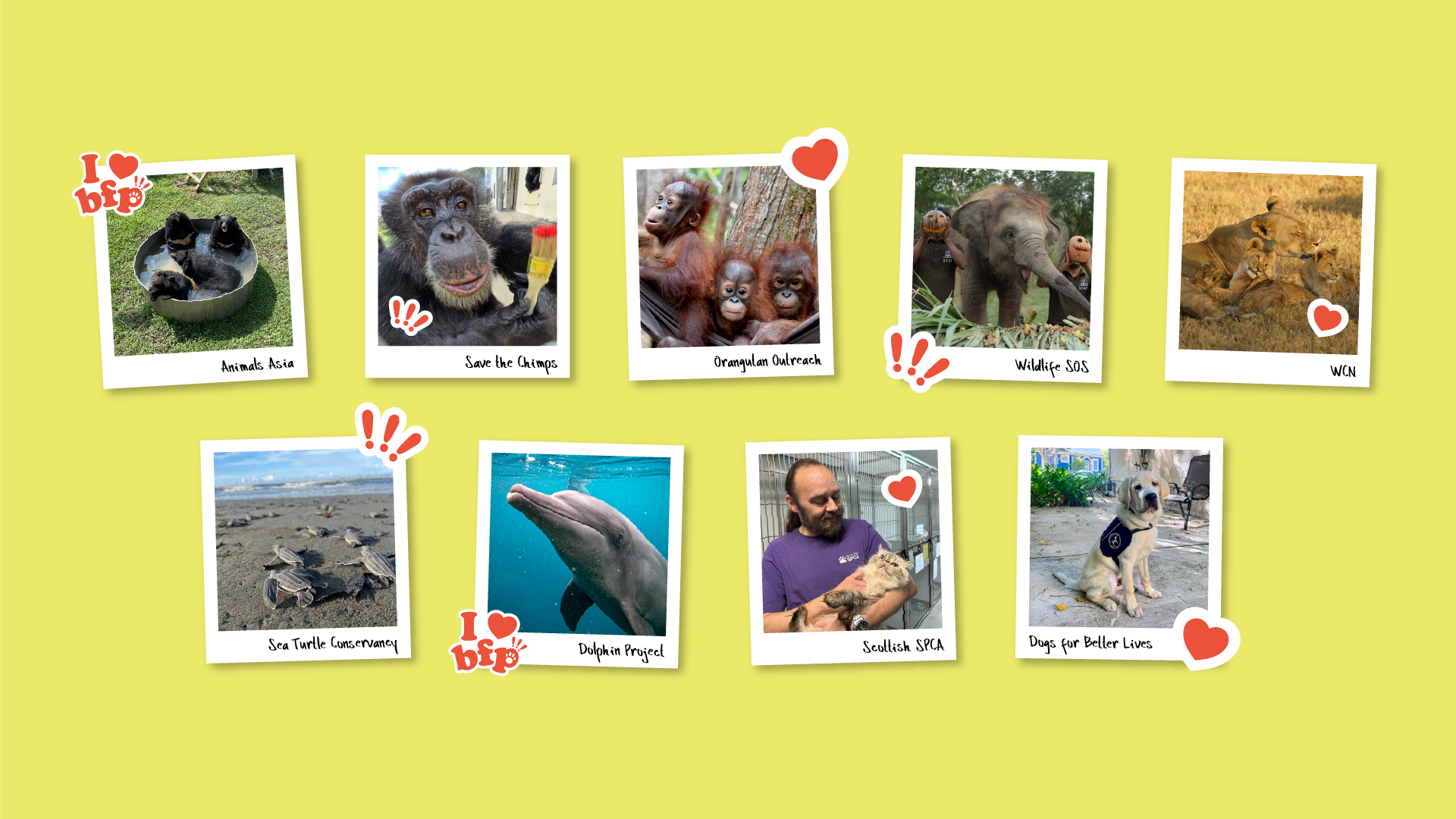 Sea Turtle Conservancy, Dogs for Better Lives, Orangutan Outreach, Animals Asia, Save the Chimps, Scottish SPCA, Dolphin Project, Wildlife Conservation Network, and Wildlife SOS.